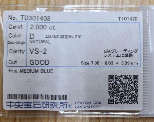 [Central Treasure Appraisal] Dream Highest quality Large grain 2ct / D color VS-2 / Good Natural Diamond loose Round Brilliant Cut