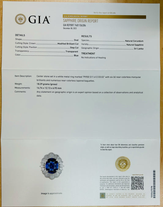 Sri Lanka Royal Blue Non -heated Natural Sapphire 11.412ct Natural Diamond 3.02ct Platinum PT900 Ring Ring Ring Birthstone