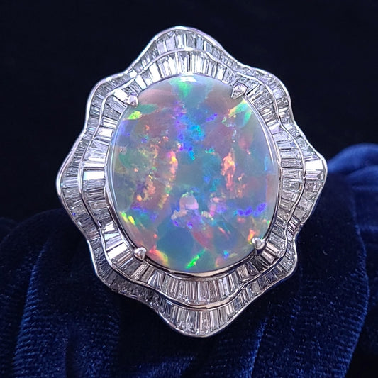 Miraculous top quality! Very rare large grains! Aurora borealis flash! Australian 21.15ct Natural Black Opal Platinum Pt900 Ringidentification reportWith