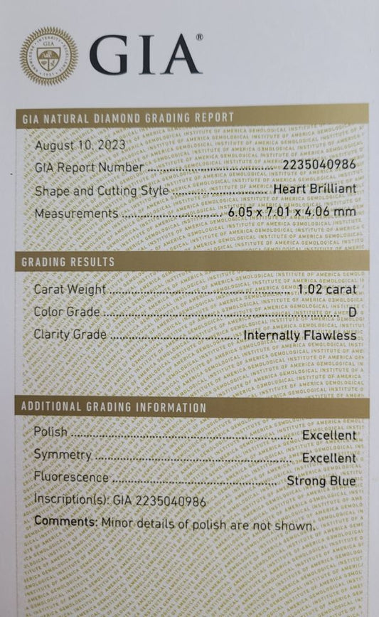 1.02ct D IF 2EX Natural Diamond loose Heart Shape [with GIA Appraisal]