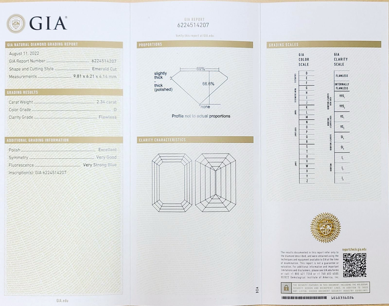 最高峰の輝きと品質を誇る、GIA鑑定書付き、2.34カラットの大粒天然ダイヤモンド。Dカラー、Flawlessクラリティ、Excellentポリッシュという、まさに究極の評価を得たエメラルドカットの逸品です。