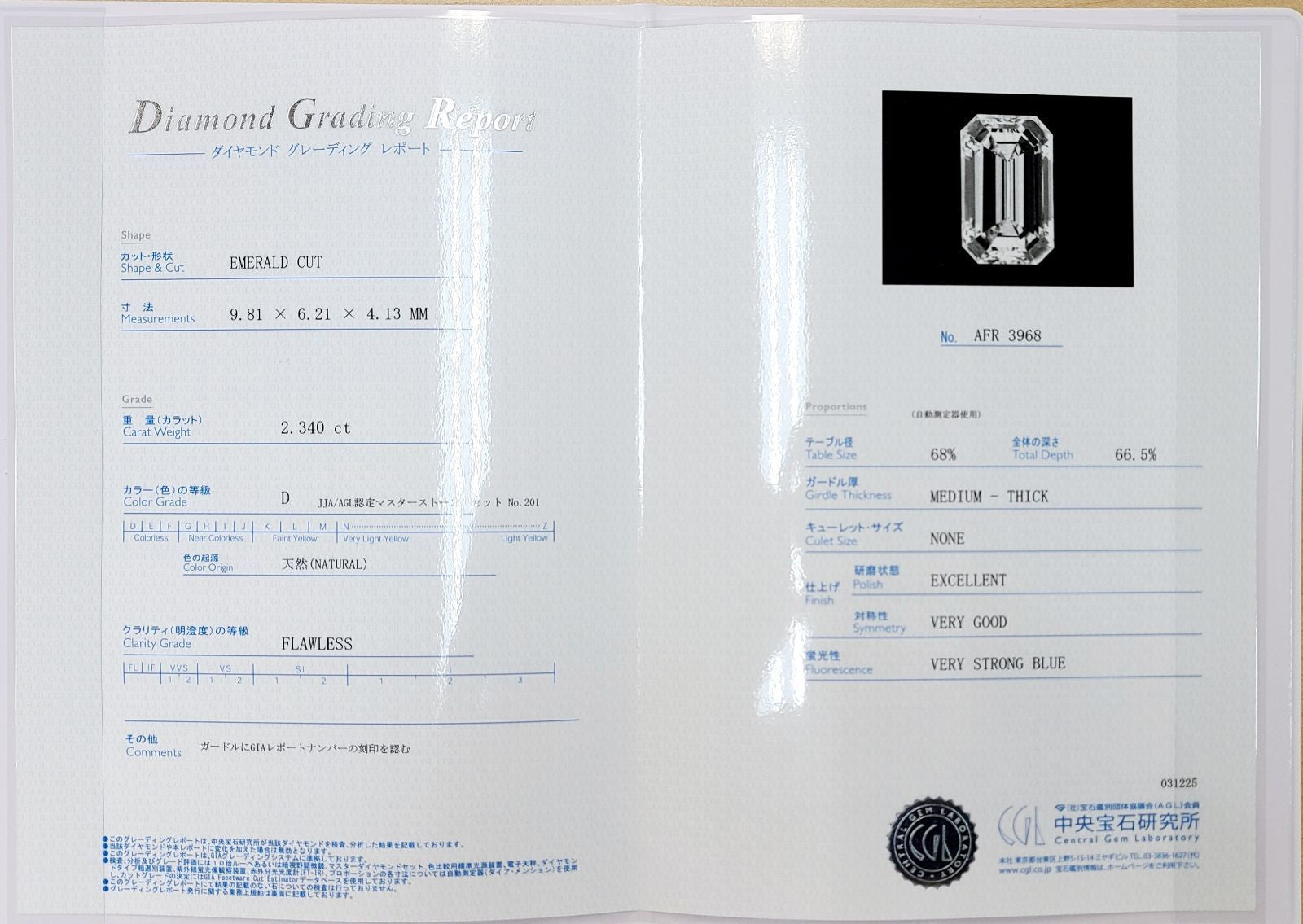 - 主石:天然ダイヤモンド 2.340ct(D・FL・EX・Emerald Cut)